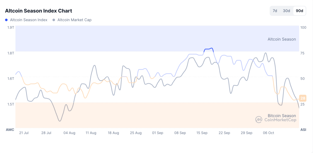 October often carries a hopeful tone for crypto. Today’s tape feels different. Both the Altcoin Season Index and the Fear and Greed Index hover at 25, a reading that tilts toward Bitcoin season, yet Bitcoin itself trades only slightly above $105,000 after sliding 13% in a week. That combination leaves altcoin holdings exposed while liquidity rotates quickly between books.