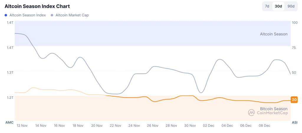 The Altcoin Season Index has climbed to 20 from 18, showing only a small improvement. Bitcoin is trading near $90,000 after slipping about 1.7% from yesterday’s levels, yet it continues to hold above the threshold that traders have treated as the main psychological line for the month.