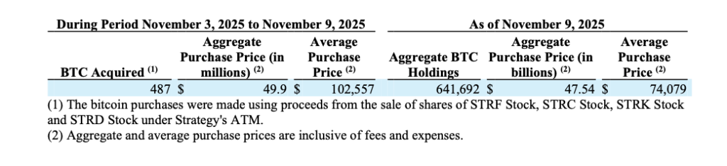 The purchases, made between November 3 and November 9, totaled $49.9 million in cash at an average price of $102,557 per Bitcoin, inclusive of fees and expenses.