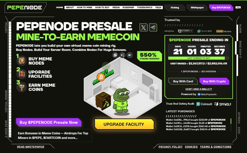 What makes PEPENODE stand out is its mine-to-earn virtual ecosystem. Instead of passive holding, users can build digital server rooms using Miner Nodes and facilities, earning simulated rewards through a visual dashboard. The concept brings gamification and competition into the meme coin space, giving holders something to do before launch.
