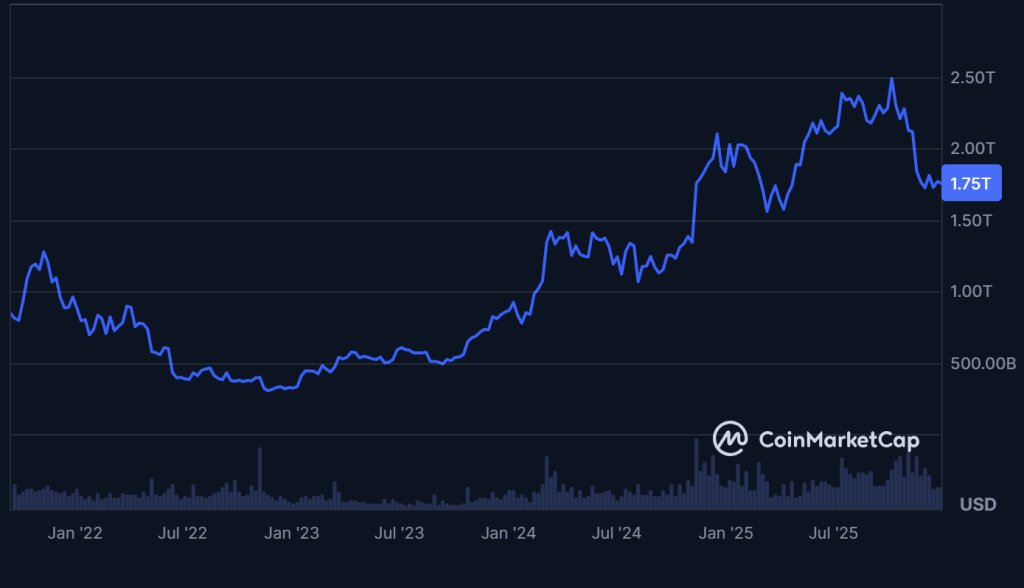 The overall market capitalisation of Bitcoin stands at $1.75 trillion, which is still a healthy number given its circulating supply of nearly 20 million.