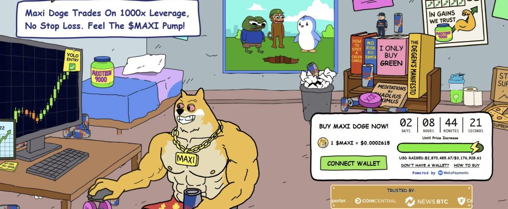 You can buy $MAXI on the official Maxi Doge website using ETH, BNB, USDT, USDC, or a bank card.