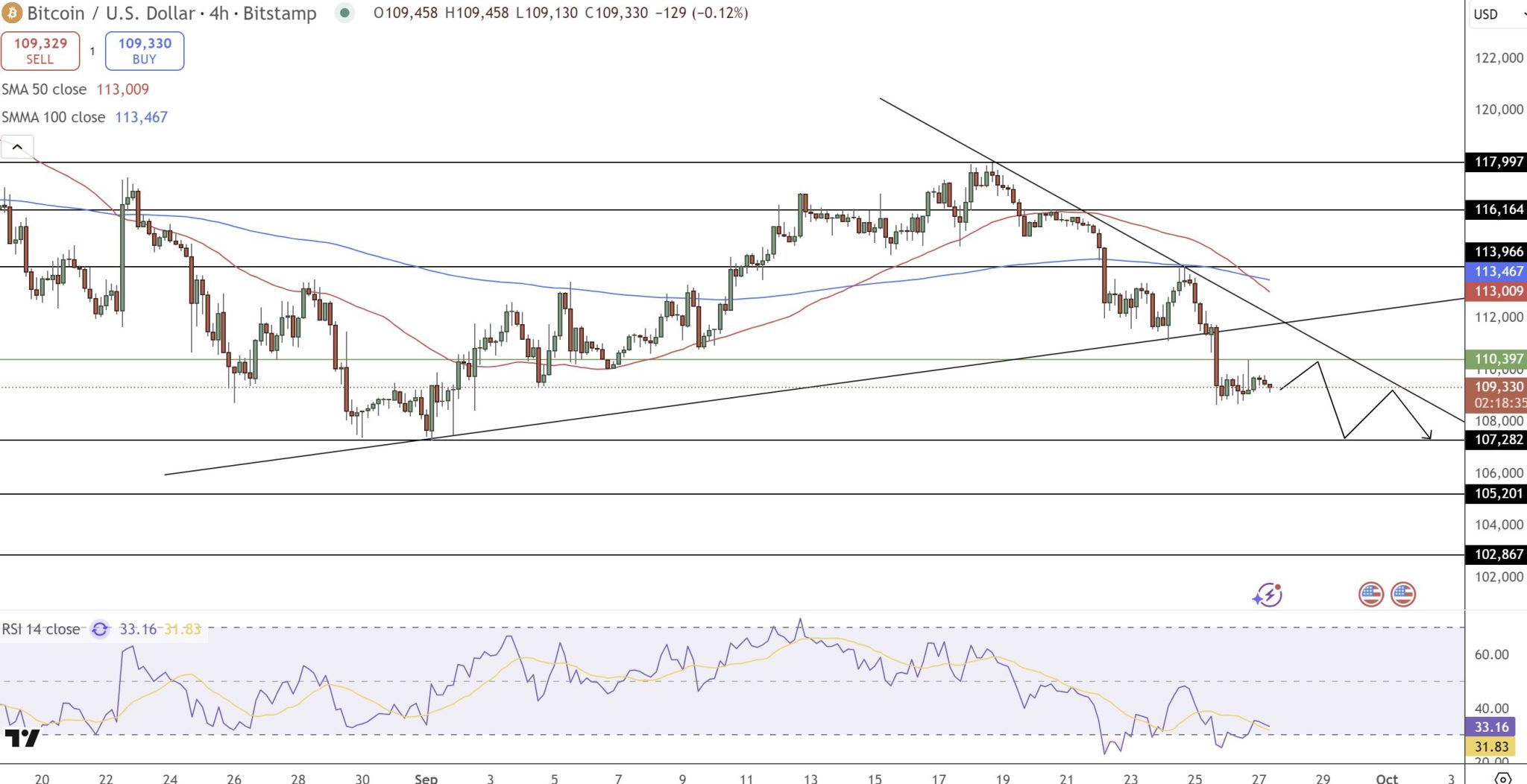 From a charting perspective, Bitcoin remains trapped under a descending trendline from mid-September. The 50- and 100-period SMAs around $113,000–$113,500 are reinforcing resistance, highlighting a bearish crossover zone.