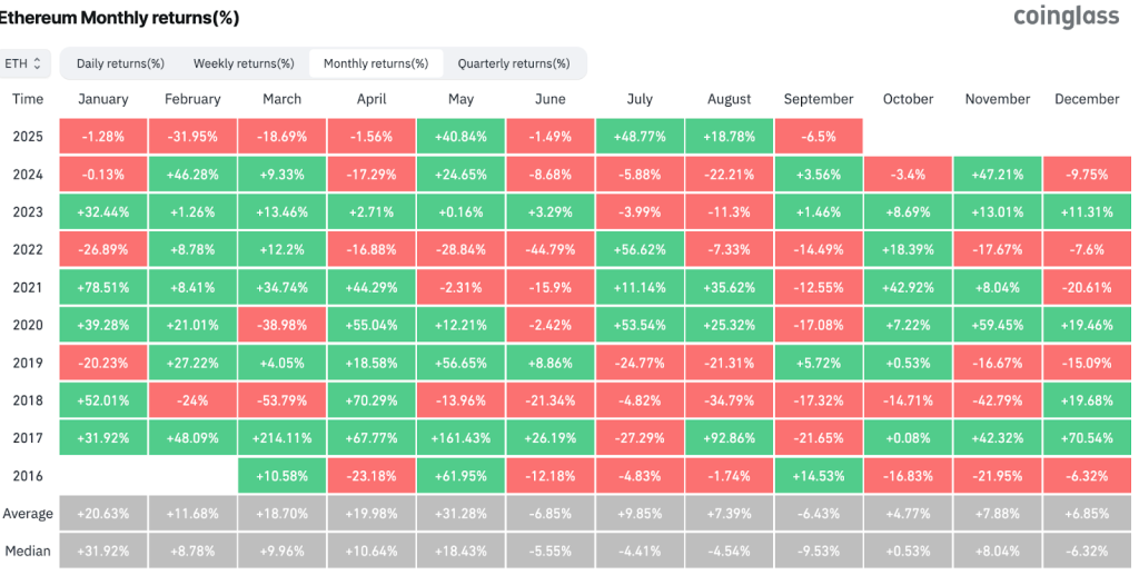 Price action has been volatile. ETH fell 6% in September but typically performs strongly in October, which has averaged nearly a 5% monthly gain, data from CoinGlass shows.