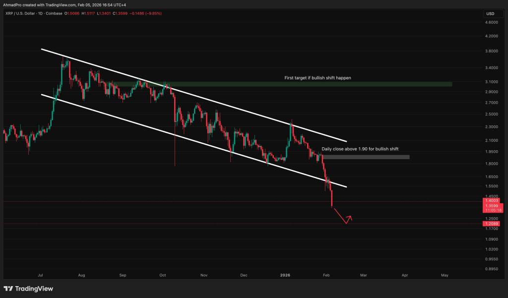 For any bullish shift, XRP needs to reclaim $1.90 on a daily close. That would signal the breakdown was exhaustion, not continuation.