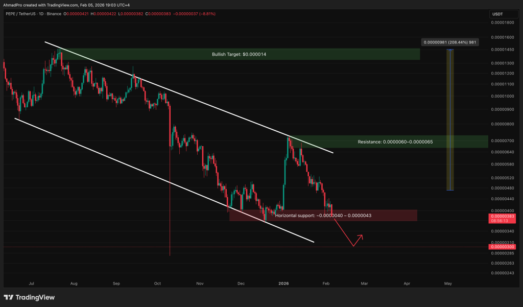 That said, PEPE is now sitting right blow the $0.0000040 to $0.0000043 horizontal support zone. This area has already triggered reactions before, which makes it important again.