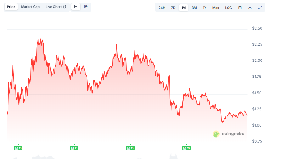 Still, the project’s token has fallen sharply, down 18.9% over the past week and more than 40% over the past two weeks, now trading at $1.19, around 50% below its all-time high of $2.41.