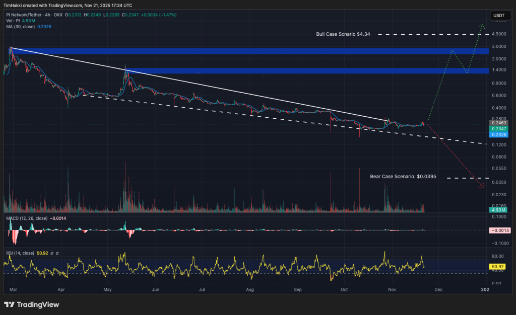 Now priced around $0.23, PI has risen 8.5% over the past week, highlighting its resilience. However, Gemini AI forecasts a bear market scenario where Pi sinks to $0.04. The alternative trajectory in a bull market is over 100x that figure, possibly reaching $4.34.