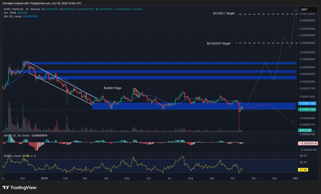Technically, the token is still consolidating within its bullish flag formations, with no confirmed breakout yet this year. Should SHIB manage to surpass the key resistance level at $0.000025 by November, it could pave the way for Gemini’s ambitious year-end target range of $0.00005 to $0.0001, representing potential 10× gains.
