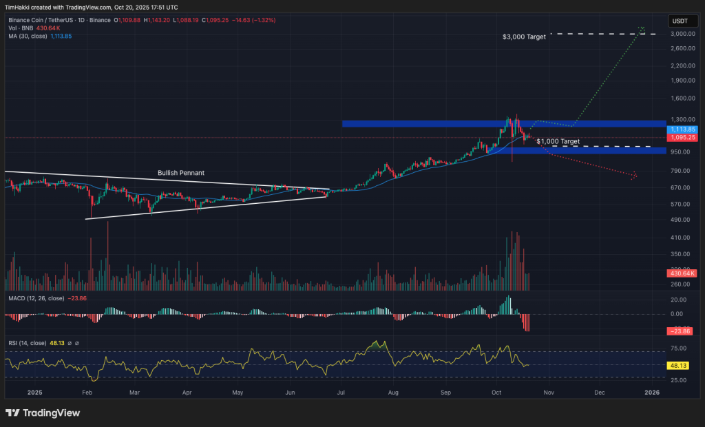 With an RSI of 48, the asset appears balanced between buying and selling pressure, consolidating around current levels. If the market sustains a rally, BNB could surge toward $3,000 by year’s end, though $750–$1,000 remains a likely support range in the event of a pullback.
