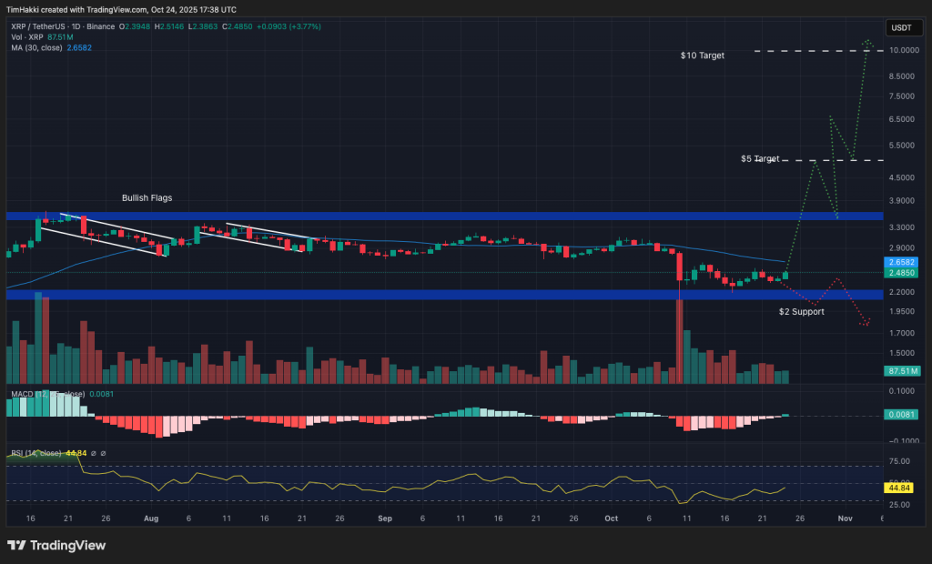 Over the past 12 months, XRP has soared 369%, far surpassing Bitcoin’s 63% and Ethereum’s 55% gains. Technical indicators highlight three notable bullish flag patterns in 2025, two of which appeared in the summer, often a precursor to significant upward movement.