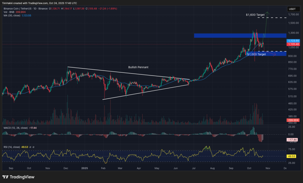 Earlier this month, BNB broke out of a bullish pennant formation and hit an all-time high of $1,369.99 before retreating roughly 19%. With its RSI now hovering around 50, the token appears to be consolidating.