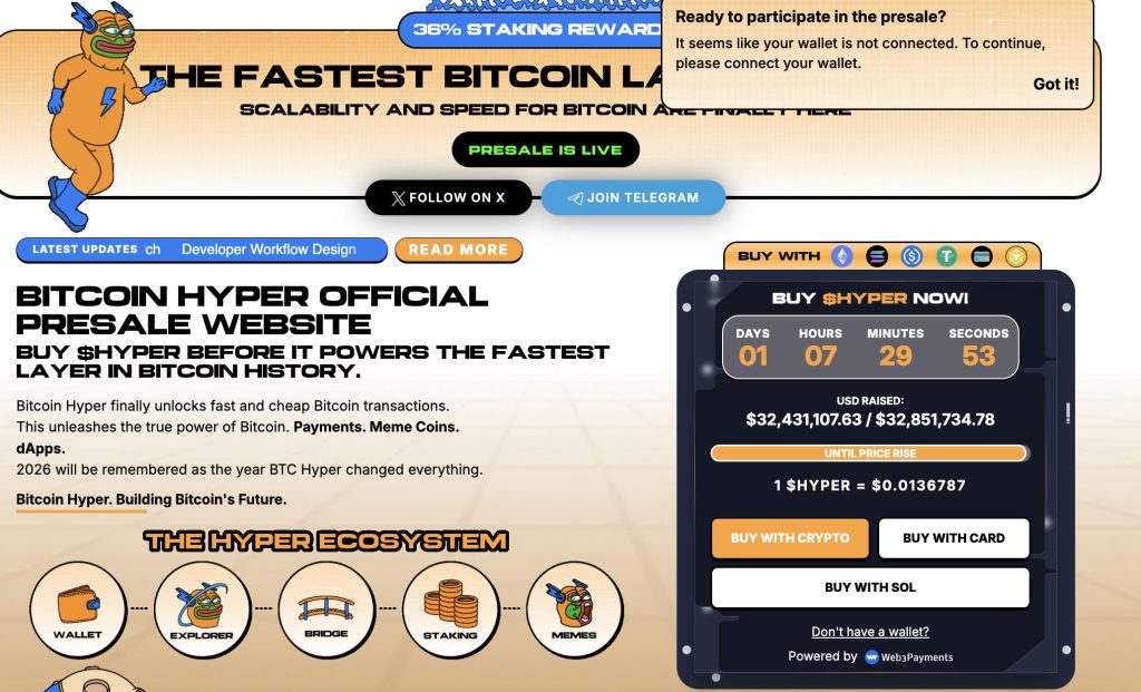 Bitcoin Hyper is positioned at that intersection. The project is building what it describes as the first-ever Bitcoin Layer 2 with Solana Virtual Machine (SVM) integration, targeting sub-Solana latency on top of Bitcoin’s security layer, with a decentralized canonical bridge for native BTC transfers and low-cost smart contract execution that Bitcoin’s base layer has never supported. The presale has raised $32,430,420.30 at a current token price of $0.0136787, with staking available during the raise.