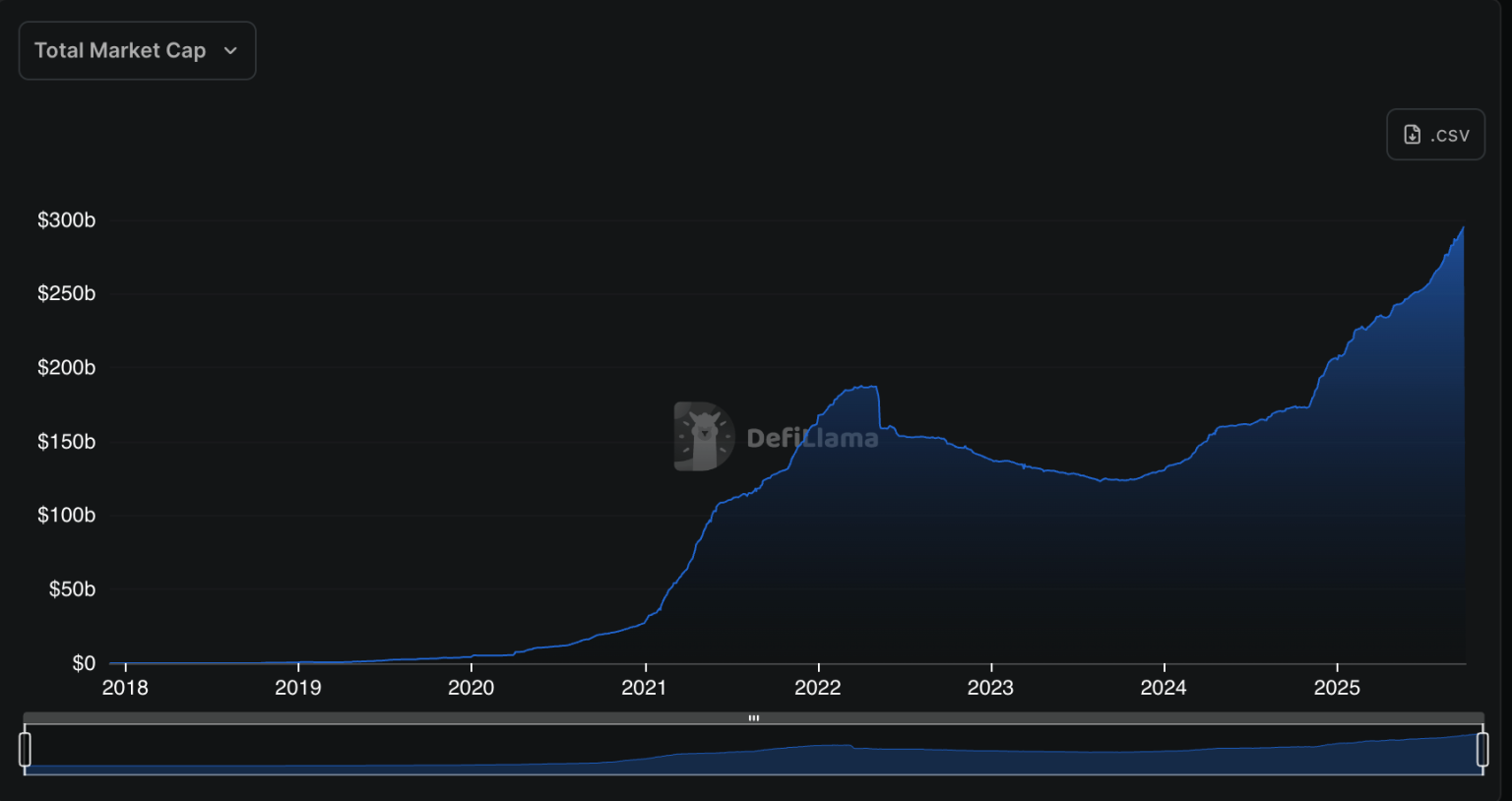 The pUSD debate unfolds against surging global stablecoin adoption, with total market capitalization surpassing $300 billion for the first time in September.