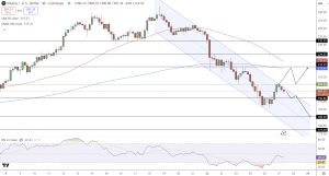 Candlestick action shows hesitation, with repeated long upper wicks suggesting sellers remain in control. Momentum is mixed—while the RSI has recovered from oversold territory near 40, it shows little evidence of bullish divergence.