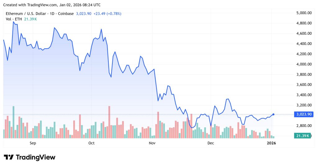 Ethereum, meanwhile, is trading around $3,024, showing early signs of stabilization after a sharp multi-month decline. The chart highlights a clear downtrend from September highs above $4,500, followed by a steep breakdown in November and choppy recovery attempts throughout December. ETH recently bounced from lows near $2,800, but upside momentum remains tentative.