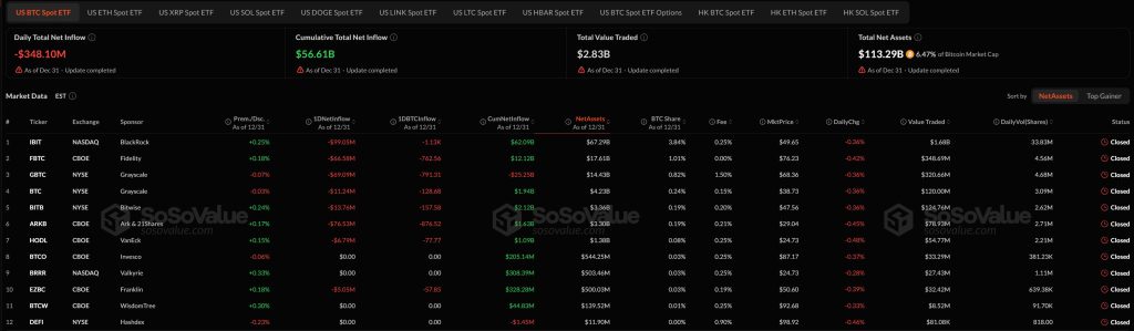 On that session, US Bitcoin spot ETFs ended the year with net outflows of $348.1 million, according to SoSoValue, despite solid activity with $2.83 billion in daily trading volume.