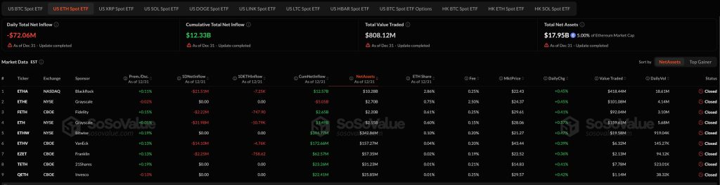 US Ethereum spot ETFs also closed the year under pressure, posting $72.06 million in net outflows on Dec. 31, alongside $808.1 million in trading volume.