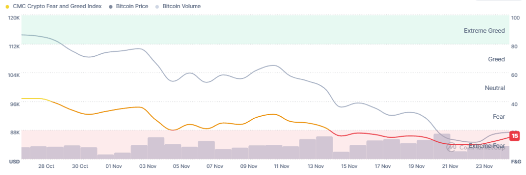 Meanwhile, the crypto market sentiment has seen a notable rise over the past day, though still staying within the extreme fear zone. The crypto fear and greed index stands at 15 today, compared to 10 held for the three previous days.