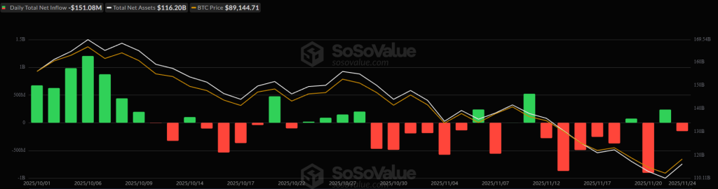 As the new week began, the US BTC spot exchange-traded funds (ETFs) turned red. On 24 November, these recorded $151.08 million in outflows. Therefore, the total net inflow pulled back to $57.48 billion.