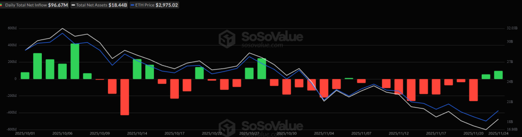 However, the US ETH ETFs recorded a second day of inflows with $96.67 million added on Monday. The total net inflow increased to $12.73 billion.