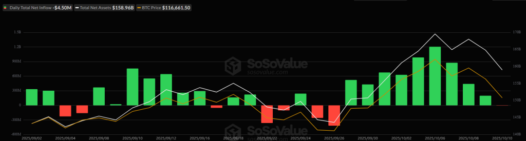 The US BTC spot exchange-traded funds (ETFs) saw $4.5 million in outflows on Friday, following significant inflows and breaking the green streak.