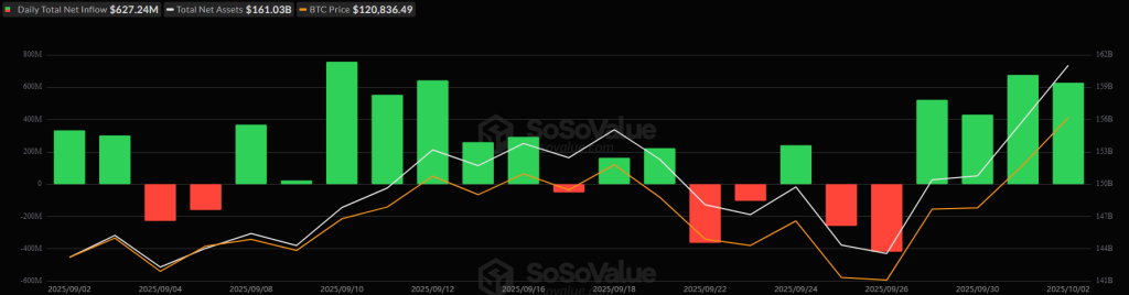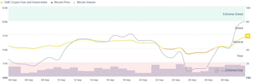 The crypto market has increased over the past day, and major stock indexes closed higher for a fifth straight session on Thursday. By the closing time on 1 October, the S&P 500 was up by 0.062%, the Nasdaq-100 increased by 0.37%, and the Dow Jones Industrial Average rose 0.17%. Notably, the US government shutdown will delay the release of economic data, including the jobs report.