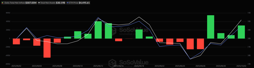 The US ETH ETFs also recorded inflows of $307.05 million on 2 October for the fourth day in a row. The cumulative total net inflow is now at $14.19 billion.