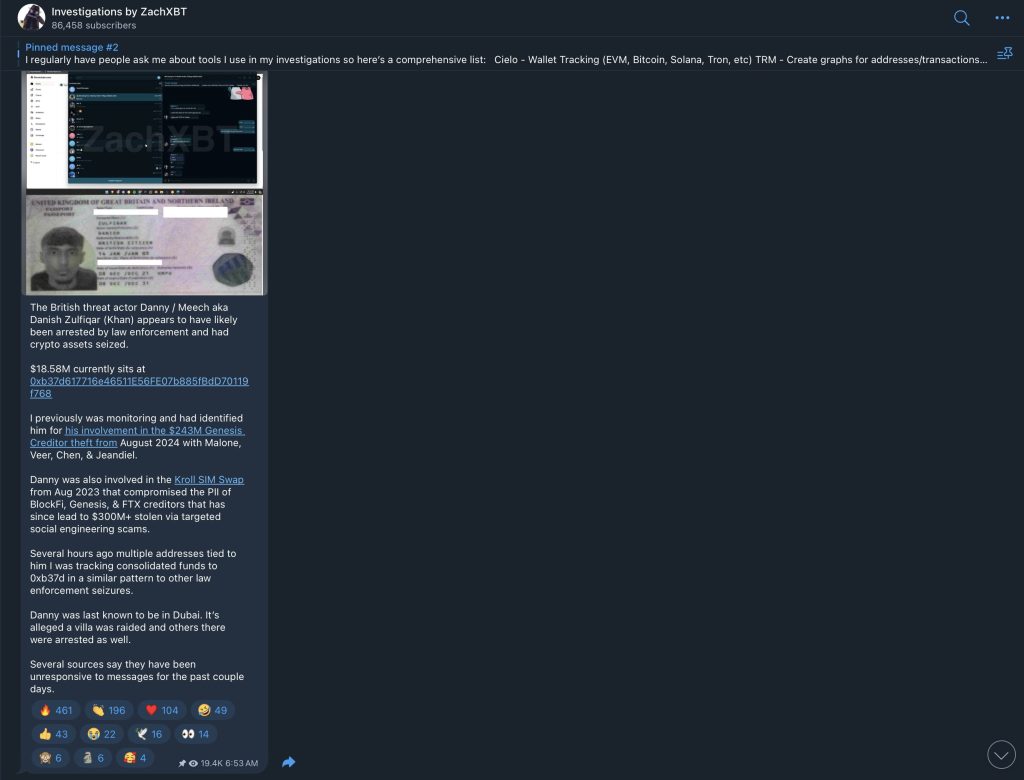 In a post shared on his Telegram channel on December 5, ZachXBT said a man known online as “Danny” or “Meech,” identified as Danish Zulfiqar, appears to have been taken into custody by authorities, with a portion of the stolen crypto allegedly seized.